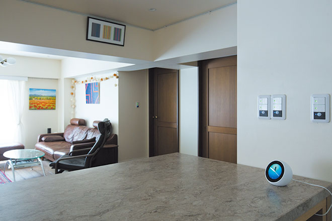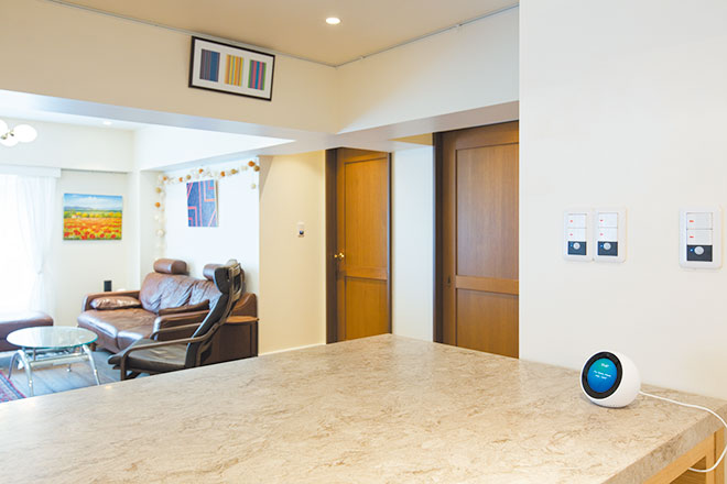 設置後の使い方としては、専用アプリで、スマホから操作するとともに、音声アシスタント(Amazon EchoやGoogle Home、LINE Clova)と連携させて、照明のON/OFFを音声操作で行っています。家にいる時は、例えば料理中にもう少し明るさが必要だと思ったら、いちいち手を洗ってスイッチを操作する必要もなく「Alexa、キッチンのあかりを点けて」と言って明るくしたり、本を読む時のあかりを調整したりと家中の照明を連携させて自在に照明をコントロール出来るので使い勝手がよく、とても重宝しています。また、外出時には照明の消し忘れがないかどうかをスマホのアプリでチェックしたり、帰宅前にあらかじめ照明を点灯したりすることも出来るので、非常に便利です。アプリの画面で各照明の電力量を見られるため、電気代の節約に貢献してくれる点にも着目しています。『Link-S²』を設置し照明をIoT化したことのメリットは大きく、単に便利さというだけではなく、自分の意志で心地よい空間に出来るという快適さを手に入れることが出来たと感じています。また、人の動きを感知する人感センサは、照明の自動点灯はもちろん、離れた場所や外出先から家族の生活を見守ることが出来る「見守り機能」を持つため、IoTスマートスイッチを活用した新しいかたちの見守りサービスにもいかされていて、家族の安全・安心を守る役割も果たしています。