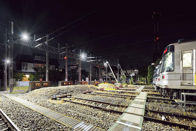 東京都足立区にある竹ノ塚車両基地は東武伊勢崎線「竹ノ塚駅」の西側に位置する、東京地下鉄株式会社の車両基地です。東武伊勢崎線と並行する形で南北方向に広がる車両基地の敷地面積は38,631m²で、日比谷線車両の定期検査などの検車区業務を行っています。
