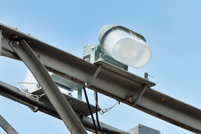 東京地下鉄株式会社では、省エネ推進の一環として駅構内をはじめとして車両や駅設備へのLED照明の導入を進めていて、車両基地も更新時期のタイミングなどに合わせてLED照明化を順次進めています。竹ノ塚車両基地は2018年3月にLED化を実施しました。既設の電架柱に設置していた水銀ランプ400W双照灯に替えて、LED投光器「レディオック フラッド ブリッツ 80Wタイプ」×2台を設置。また、場所に応じてLED防犯灯「レディオック ストリート 40VA」を使用し、既設照明と同等の明るさを確保しつつ、省エネ、省メンテナンスにも貢献する照明環境としました。
