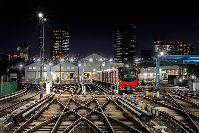 東京地下鉄株式会社では、省エネ推進の一環として駅構内をはじめとして車両や駅設備へのLED照明の導入を進めていて、車両基地のLED化も順次進めています。小石川車両基地については、2021年2月にLED化を実施しました。既設水銀ランプ投光器に替えて、LED投光器「レディオック フラッド ブリッツ 80Wタイプ」を設置。また、地上部の保守管理用途で軌道照明としてLED防犯灯「レディオック ストリート 20VA」を設置し、既設照明と同等の明るさを確保しつつ、省エネ、省メンテナンスにも貢献する照明環境を創出しました。