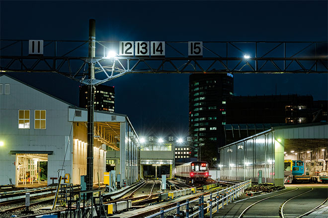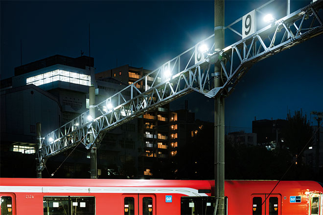 今回のLED化更新にあたっては、近隣に住宅地が控えていることもあり、周辺環境への光漏れに配慮するとともに、作業員及び車両運転士へのグレアを抑えることにも十分留意のうえ、配光角度などの検討を重ねたうえで実施しました。LED照明に更新後の消費電力は半分以下になり、消費電力の大幅削減を実現しつつ、夜間も車両基地を明るく照らして安全性の向上に寄与しています。