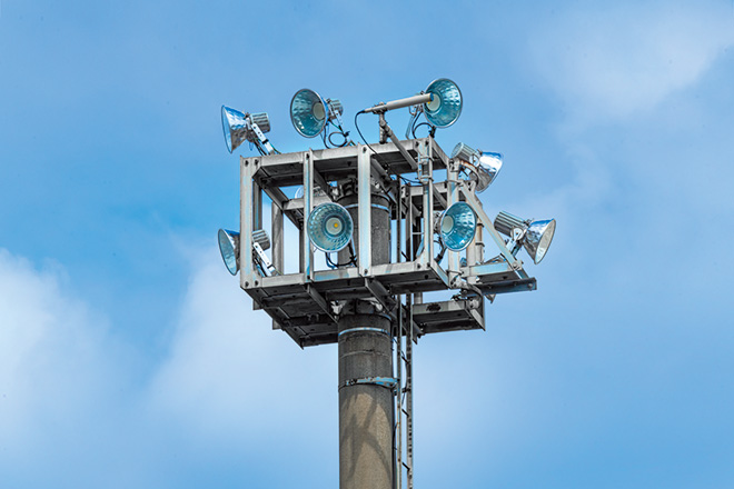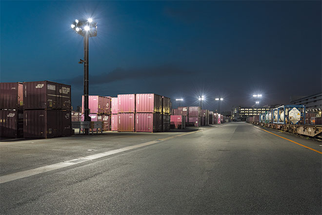 日本貨物鉄道株式会社では、2022年3月にコンテナホームを照らす照明設備をLED化する改修工事を実施し、既設HID投光器に替えてLED投光器「レディオック フラッド スポラート」をご採用いただきました。高効率で高出力、またHID投光器のデザインを継承したLED投光器で構内を明るく照らして夜間作業の安全性を確保するとともに、消費電力とCO₂排出量の削減に貢献し、サステナブルな物流を担う貨物駅にふさわしい照明環境をつくり出しています。