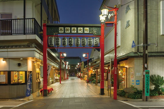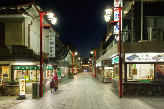 西新井大師商栄会は、関東厄除け三大師に数えられ、古くからお大師さまとして親しまれている西新井大師(智山遍照院總持寺)の門前町に位置する約70店舗の商店街です。参道には名物の草だんごやせんべいを売る店、割烹料理店などさまざまな業種の店舗が並び、参拝に訪れる多くの人々で賑わいをみせています。西新井大師商栄会では、参道と商店街に設置されている照明柱の光源をLED化する工事を2012年秋に実施しました。金色の灯具と朱色の灯柱がアクセントとなっている照明柱は設置当初、水銀ランプ200W×2灯の灯具でしたが、数年前に省エネ化を図りランプをセラミックメタルハライドランプ100Wタイプに切り替えました。今回は更なる省エネ・CO₂排出抑制を目的として、足立区・東京都の補助金を活用し、レディオック LEDライトバルブ30Wへの更新を実施したものです。