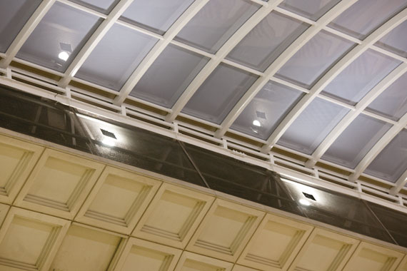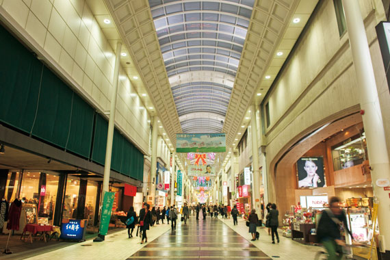 Myリストに追加上通(かみとおり)は、熊本市の目抜き通りである通町筋から並木坂までの全長600m、幅11mの通りの商店街です。商店街の南部分は、約350mの全蓋型アーケードとなっていて、飲食店、衣料品店、書店などの専門店が軒を並べています。天井の高いアーチ型の屋根から日光が差込み、明るく開放感溢れる通りは、パリのオルセー美術館をイメージして、1988年につくられました。2013年秋、上通アーケードでは、ECO改修事業を実施し、老朽化した屋根の中央部分(ポリカーボネート製)を付け替えるとともに、照明も既設水銀灯から全てLEDへと交換しました。既設の照明位置はそのままにダウンライト、アッパーライト、壁面投光器などをLED照明へと更新し、大幅な省エネ・省メンテナンスを実現。イルミネーションなどさまざまなイベントに応じて明るさをコントロール出来るよう、LEDダウンライトとして、調光可能タイプの「レディオック ハイベイ ラムダ」を採用いただきました。改修後は「とても明るくなった」とお客さまから好評をいただいています。