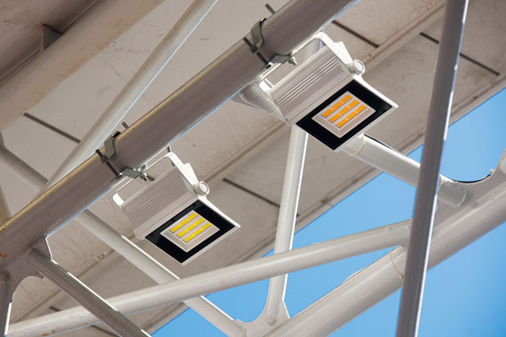 2014年12月には、老朽化した照明器具をLED化する工事を実施し、トータルの数量を削減しつつ、LED化による省エネを図りました。これまで水銀ランプを光源としていた照明器具に替えて、コンパクトなLED投光器(レディオック フラッド ネオ 100W)に更新し、昼白色と電球色を組合せて設置することで、商店街全体の空間に暖かみを持たせました。全237台設置したLED投光器は4系統に分かれていて、時間帯に応じて点灯パターンを変え随時適切な照明環境を作ることが出来、深夜の常夜灯など防犯効果にも役立っています。また、アーケード入口付近の街路灯についてもLED化を実施しました。