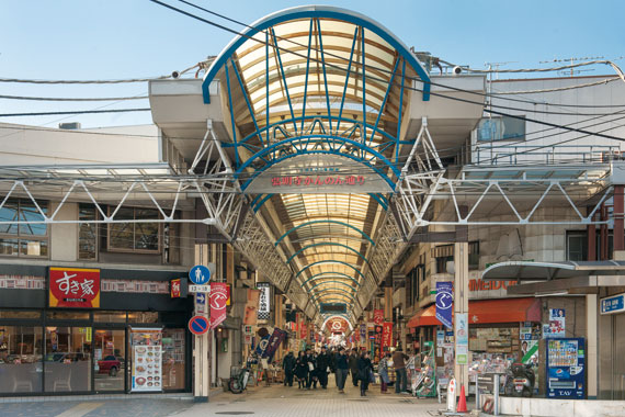横浜市南区にある弘明寺商店街の歴史は古く、横浜最古の古刹・弘明寺の門前町として栄えてきた場所にあります。1956年に架けられ、当時は東洋一とたたえられた全長270mのアーケードは、その後2001年に全長312mのアーケードに改装し、現在は約120店舗が加盟する大きな商店街として地元の皆さまに親しまれています。市営地下鉄弘明寺駅と京急弘明寺駅をつなぎ、鎌倉街道に面した弘明寺商店街は交通の便もよく昼夜問わず賑わいがあり、下町の情緒溢れる元気な商店街です。商店街の中央を流れる大岡川に架かる観音橋は、桜の名所として人気があり、また、冬の初詣や節分、夏の縁日、秋の紅葉など四季を通じて楽しんでいただける商店街となっています。