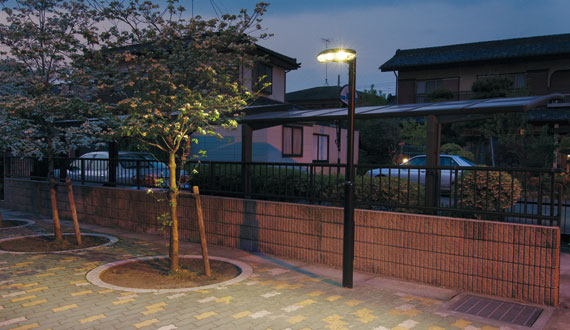夜間も安全に歩道を照らし出すことが出来るよう、「レディオック ストリート」(5Wレンズ型白色LEDユニット×3個)を使用し、平均水平面照度5ℓx以上を確保しています。当該LEDはLED光源寿命が40000時間(光束維持率70%)と長く消費電力が少ないため、メンテナンスコストなどを削減できる点にも着目しました。また、照明器具は基本的に20mピッチとし、緊急時には車両が通行出来るように道の端に配置しています。
