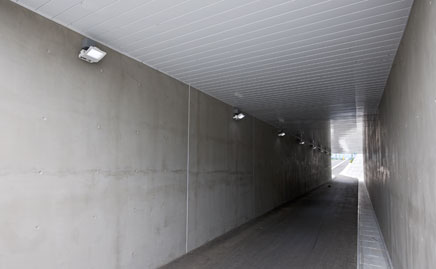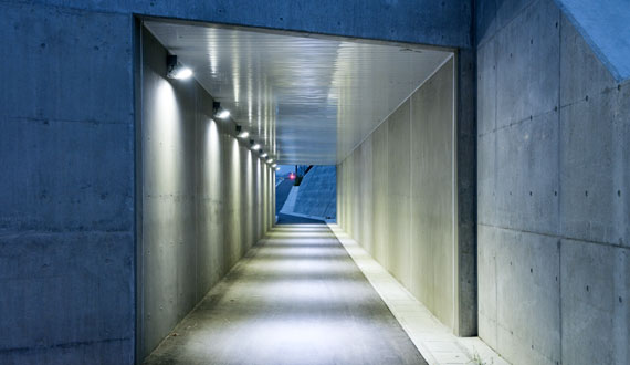 Myリストに追加福島県郡山市熱海町から本宮市に至る一般県道石筵本宮線と東北自動車交差部の高速道路下部に、歩行者用の横断地下道が新設されました。地域住民の方々の安全を守る横断地下道を照らす照明については、車道用トンネル器具との比較検討を行い、最終的にLED投光器が採用されました。コンパクトで取付角度もフレキシブルなLED投光器「レディオック フラッド ポケット」は、必要な場所を効率よく照らし、省エネ、CO₂削減に貢献します。また、電流値を抑えることで推定寿命60000時間の長寿命形となっています。