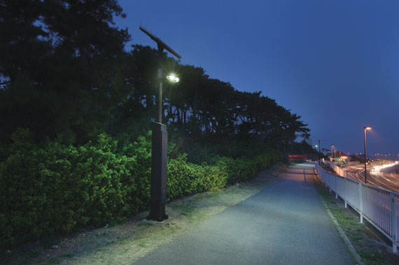 Myリストに追加太平洋岸自転車道は、西湘バイパス大磯港ICから大磯西IC付近までの全長約2.5kmのバイパス沿いにある自転車道で、大規模自転車整備事業の目玉の一つとして構想され、千葉県銚子市を起点に和歌山県和歌山市まで総計画延長1,200kmの一部として整備されたものです。この自転車道は、相模湾を眺めながら走ることができる海辺のサイクリングロードとなっており、サイクリングのみではなく、ランニングや本格的なウォーキングコースとしても人気があり、地域の方々に親しまれていることから、夜間における利用者の安全性を考慮して照明器具が設置されました。停電時に事故につながる可能性を回避するため、太陽光の自然エネルギーを夜間照明に利用する太陽灯が採用され、白色系LEDの光でサイクリングロードを安全に照らし出しています。