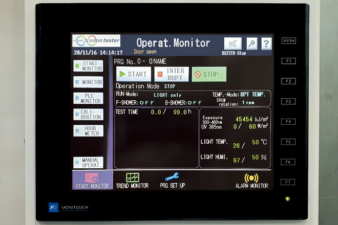 太陽光の分光分布に最も近い条件で試験ができる同耐候性試験機は、高い相関性に加え、照度を可変できる超促進耐候性試験機として、屋外で太陽光に曝される2輪車・4輪車の材料実験などにご活用いただいています。