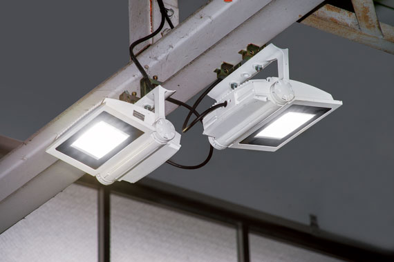 天井部には高効率のLED高天井用照明器具レディオック ハイベイ ラムダ及びレディオック LEDアイランプSPをご採用いただき、大幅な省エネと照度アップを実現しました。また、工場内の整備・修理エリアにおいては、天井照明のみではトラックの荷台の影が出来てしまい、足回りやエンジンルームなどの部分が暗くなりがちです。そのため、天井照明をトラックが入る場所の真上を避けるよう配置するとともに、コンパクトで高出力のLED投光器レディオック フラッド ネオ 130Wをトラックの側面から投光できるよう配置し、より安全で快適な作業環境づくりを重視した設計となっています。
