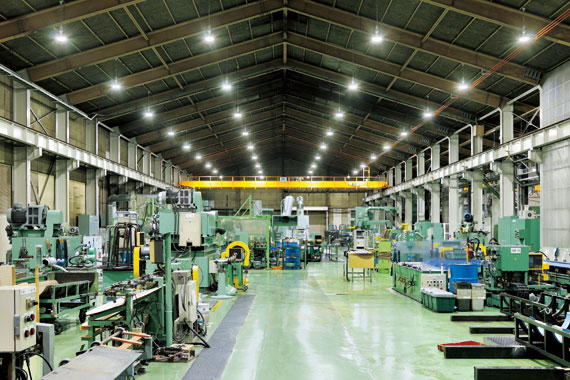 東京都中央区に本社を置く秋山精鋼株式会社は、精密機械、電子機器の構成部品に使用される快削鋼など、特殊鋼の2次加工品メーカーで、東京本社、大阪支店、名古屋営業所、諏訪営業所を中心に販売拠点を、茨城県石岡市、埼玉県八潮市、中国、ベトナムに製造拠点を持ち、国内はもちろんグローバルに事業を展開しています。秋山精鋼株式会社では、埼玉県八潮市にある埼玉工場の照明をLED化する照明改修を実施し、既設HID照明に替えてレディオック LEDアイランプSPを採用しました。
