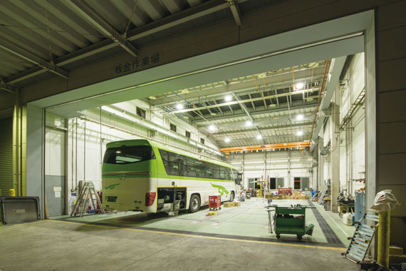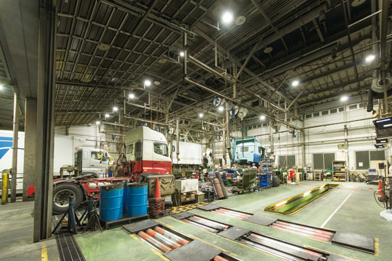 Myリストに追加三重日野自動車株式会社は三重県四日市市に本社を置き、日野自動車株式会社の販売会社として、三重県をテリトリーにトラック・バスの販売及びメンテナンスを行っている会社です。2015年9月、本社敷地内にある敷地面積約12,000m²の工場の照明改修を行い、既設水銀灯、高圧ナトリウムランプに替えてLED照明に更新しました。省エネ推進とともに照度アップを目的としたもので、天井部にはレディオック LEDアイランプSPを、さらに壁面にはコンパクトで高出力のLED投光器「レディオック フラッド ネオ」を設置しました。