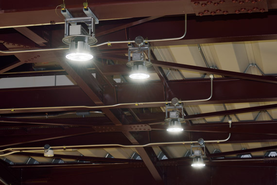 検修庫内を照らす照明には、高天井用LED照明器具「レディオック ハイベイ アルファ」を、またSLピット内照明として「Iビーム形LEDピット灯(特注)」をご採用いただきました。機種選定にあたり、「レディオック ハイベイ アルファ」は建物の天井が高いため光の広がりを考慮して、広角タイプと中角タイプを組合わせて設置しました。「Iビーム形LEDピット灯(特注)」については、現場サイドからのご要望にお応えして台数及び配置位置を決定し、作業者へのグレア対策を考慮した仕様としました。