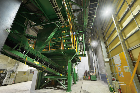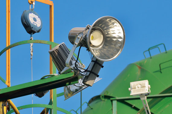 工場敷地内の照度が全体的に低下していたこともあり、安全性の面から既設水銀ランプに替えてLED照明に更新し、照度アップを図りました。工場内の建屋内照明にはLED投光器「レディオック フラッド ネオ130W」を、構内を照らすためにサイロ上に設置した照明には「レディオック フラッド スポラート210W」を採用するなど、場所に応じて適切なLED照明器具を設置。構内に常時出入りするトラックの運転手がまぶしさを感じないよう、投光器の角度にも配慮しています。