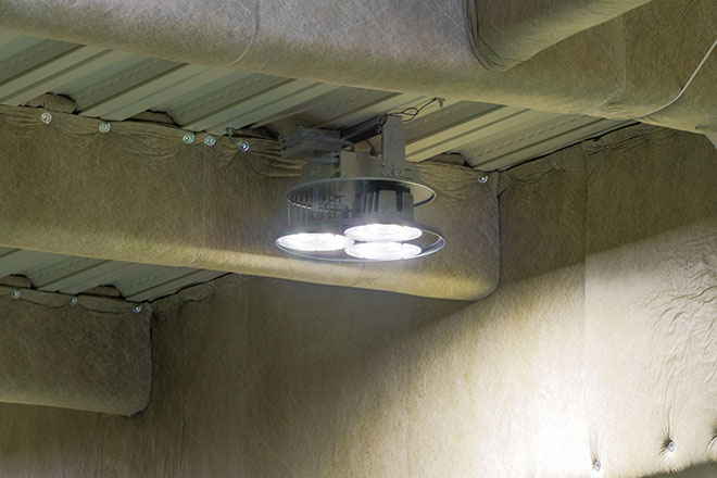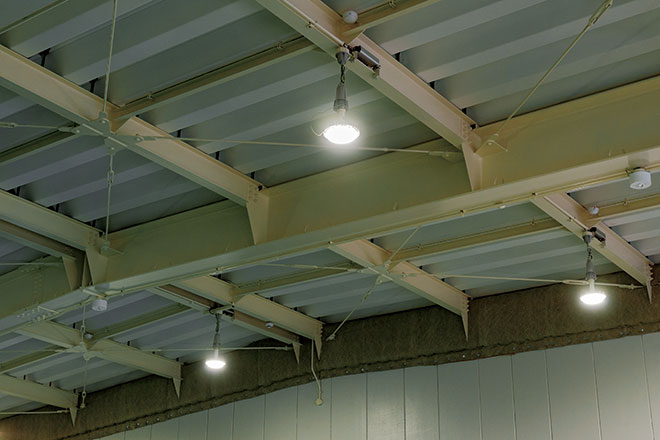 照明設備については、環境保全及び省エネ推進の観点からLED照明とし、LED高天井用照明器具「レディオック ハイベイ アルファ 320W」を採用しました。1階の工場は、クレーンで部品を吊り上げて移動させる作業などをより安全に行う目的で天井の高さを旧工場よりも3m程高くして約14mもあるため、通常の工場照明の設定照度よりも高い500ℓxとし、十分な明るさを確保しました。溶接や電気部品の細かい組立作業がある工場内を均一に照らし、作業環境の向上に寄与しています。工場2階部分は倉庫として使用しており、一部に旧工場で使用していたLED照明器具「レディオック LEDアイランプSP」を設置しました。天井の高さがある工場は開放感があり、外壁を金属断熱材の優れた断熱効果で、夏場も快適な作業環境となっています。
