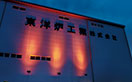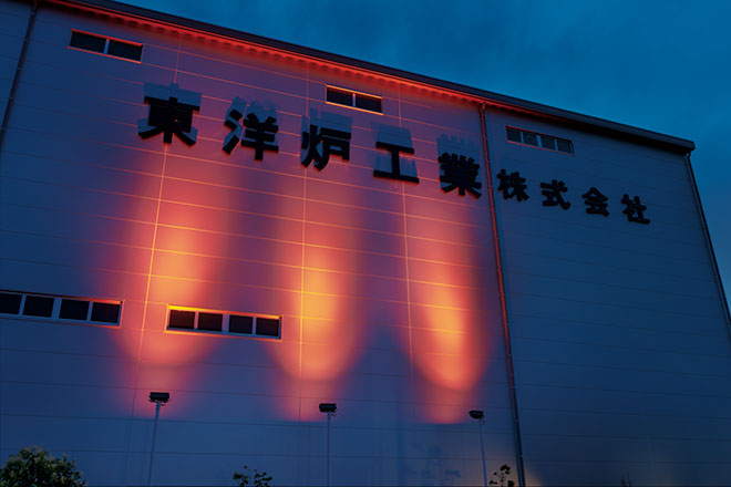 また、夜間には工場東側の社名看板を3台のフルカラーLED投光器「レディオック フラッド フルカラー」で照らし出しています。ライトアップは、連続炉の炎をイメージし、慎重に色味を選定しました。この光は、阪和自動車道など遠景からものぞむことが出来るため、企業PRの役割を、そして夕刻、営業を終えた社員が会社に戻る際に暖かく迎えるあかりの役割も果たしてくれるのではないかと考えています。