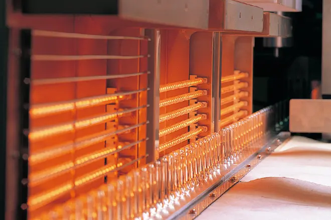 二軸延伸ブロー成形機は、ペットボトルに代表されるプラスチックボトルの成形機です。操作はLEDタッチパネル方式なので、問答式操作により容易なオペレーションを可能にしました。特に重要な工程であるプリフォーム加熱では、いかに均一に安定して熱を加えるかという点に留意のうえ、岩崎電気のハロゲンランプを採用しました。プラスチック材料に対して波長が適している光源であり、また立ち上がりが早く長寿命であることから選択したものです。ランプは最高10段まで設置することができるので、各商品に応じたきめ細かな調整が可能になっています。