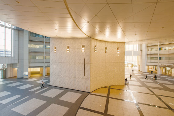 晴海トリトンスクエアは、東京都中央区晴海のウォーターフロントにある魅力あふれる複合都市空間です。東京ドーム約8倍の敷地に、オフィスビル、商業施設、住宅、ホールなど、「職・住・遊」のそれぞれの機能を満たした施設がバランスよく配置されています。2001年にオープンした晴海トリトンスクエアでは、現在5か年計画で共用部の照明改修が進行中です。2年目にあたる2012年11月にはグランドロビーの投光照明の改修工事が実施されました。メインゲートからエスカレータで2階に上がった場所にあるグランドロビーは、3棟のトリプルタワー(X・Y・Zの各高層オフィスタワー)へのエントランスとして、また、賑わいのある商業施設へのアプローチとして位置付けられ、多くの人々が行き交う場所となっています。高い天井から陽光が差し込む開放的な空間は、4階にあるオーバル型の第一生命ホールを上に乗せたシリンダー状の構造を特徴としています。