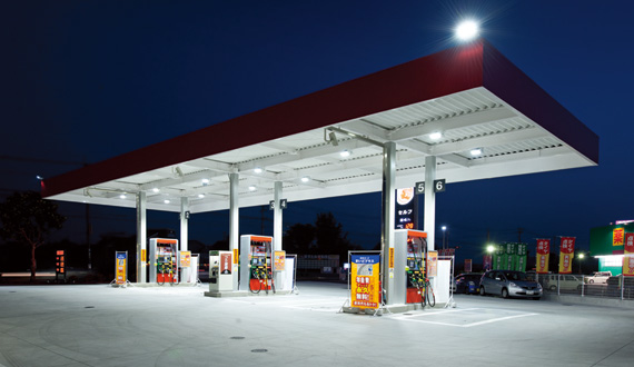 最新の設備を備えたセルフ式ガソリンスタンドを省エネに配慮したLEDの光で快適に照らし出す