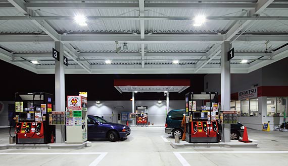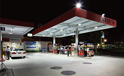 東京都葛飾区の環七沿いに立地する(株)コプローサいのうえ おくどSSが2010年6月、建て替えにより新規オープンしました。24時間営業のセルフ・サービスステーションを夜間も安全・快適に照らす照明として、LEDを光源とするLED高天井用照明器具「レディオック シーリングHB」とポールライト用投光器「レディオック フラッド ネオ」を設置、消費電力の低減とCO₂排出量の削減を図っています。出光グループは、地球環境と調和した豊かな社会の形成、持続可能な社会の実現に貢献することを目指し、地球温暖化対策、大気汚染対策など環境問題に積極的に取り組んでいます。その一環としてSSに於いては、自社社有SSを対象にサインポール照明のLED照明への切り替えを進めるなど、環境負荷低減に向けたさまざまな対策を実施してきました。屋内外照明についても長寿命、低消費電力、水銀レス、低誘虫を特長とするLED照明の導入を検討中で、現在、本SSを含め5店舗にLED照明を設置し、データを分析・検証段階にあります。
