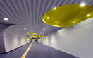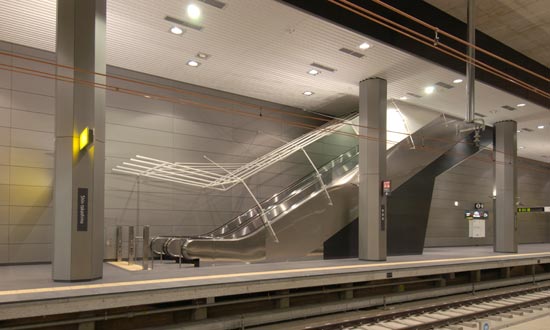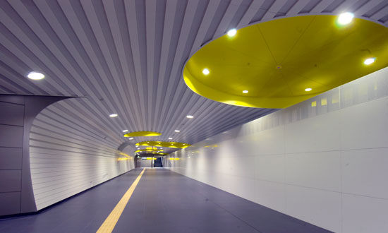 駅の顔となる出入り口は運行時間内は白のLED、終電がなくなると青のLEDによって駅を浮かびあがらせたような輝きを放っています。駅の通路は300ℓx以上の明るさを確保し、コンコース階では500ℓx以上としながら各階にグラデーションをつけ、ホーム階では深海のイメージでやや暗く、上層階に行くにしたがって明るい感じになるように計画されています。