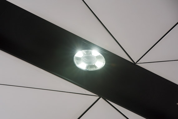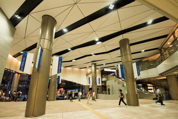 また、駅に隣接して充実した施設が揃っているショッピングセンター「青葉台東急スクエア」があります。駅中央口改札と商業施設をつなぐコンコースを照らす照明には、これまでメタルハライドランプ及び白熱ランプを使用していましたが、今回のLED化でベース照明には色温度5000Kの高天井用LEDダウンライト「レディオック ハイベイ ラムダ150Wタイプ・中角タイプ」を26台設置。また端部のダウンライトには色温度3000KのLEDダウンライト「レディオック LEDダウンライト クラス200」を設置しました。同じ空間に異なる色温度の器具を使用し、空間にアクセントを持たせています。高出力のLED照明器具を採用することで、照明器具の灯数を減らしつつ明るさを向上させ、消費電力も既設に比べて約63%削減し、大幅な省エネを実現しました。