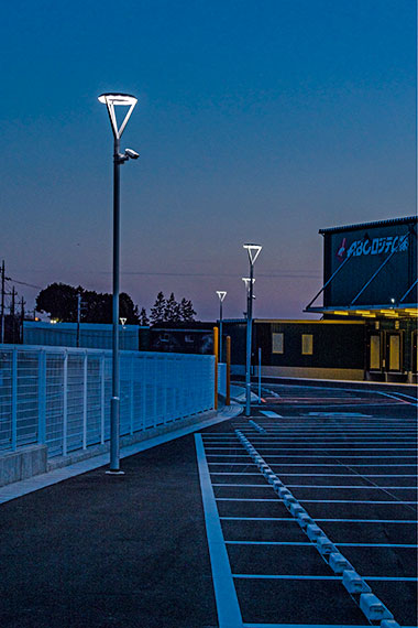 宇都宮物流センターの照明設計については、冷凍倉庫(第1センター)と冷蔵倉庫(第2センター)により構成され、延床面積14,076m²の大型倉庫を照らす照明器具として、冷凍・冷蔵倉庫に対応した横長配光・丸形配光のLED高天井用照明器具「レディオック デポライナー」を採用しました。冷凍倉庫ではフォークリフトで棚を移動する際のグレアを抑制しつつ、通路の明るさを確保できるよう留意のうえ配置し、シンプルなデザインで天井面をすっきりと見せています。保護等級IP65の同照明器具は、使用温度範囲が-30℃から+50℃と幅広いため、-30℃に設定されている冷凍倉庫にも対応しています。敷地内に併設されている整備工場は、窓から差し込む外光が開放的な印象を与える延床面積416m²の建物で、天井面にLED高天井用照明器具「レディオック シーリングHB」を設置して、明るく快適な作業空間の創出を図りました。また、敷地内の外構照明には、デザイン性・機能性を重視して全方向配光・高効率形のLEDポールライト「レディオック エリア タイプD」を採用し、省エネに貢献する爽やかな光で夜間の安全性を高めています。