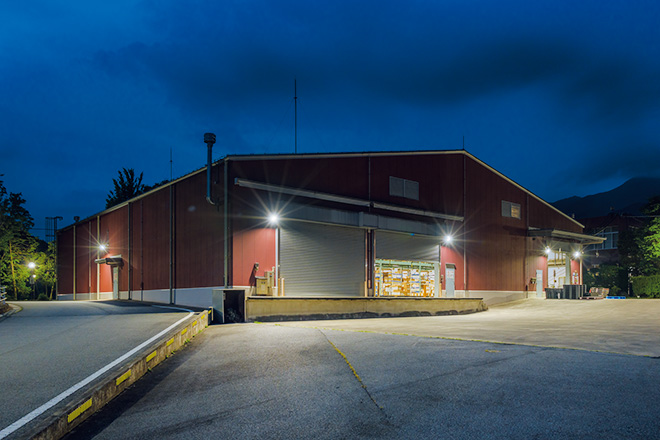 山梨工場では、2023年3月、省エネ環境負荷低減に向けた取り組みの一つとして、防爆照明をLED化する工事を実施しました。既設防爆照明器具に替えて、防爆形LED照明器具「レディオック EX ディオZ1」及び「レディオック 防爆形直管LEDランプ照明器具」を工場や倉庫にご採用いただきました。幅広いエリアで使用可能、優れた省エネ性能、軽量・コンパクトな設計を特長とする「レディオック EX ディオZ1」と、電源内蔵形直管LEDランプを使用しメンテナンスコストの大幅削減に貢献する「レディオック 防爆形直管LEDランプ照明器具」を場所に応じて適切に配置することで、工場・倉庫を明るく安全に照らし、作業環境の向上にも寄与しています。