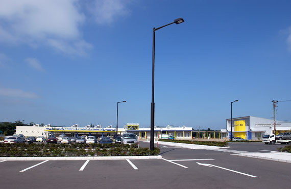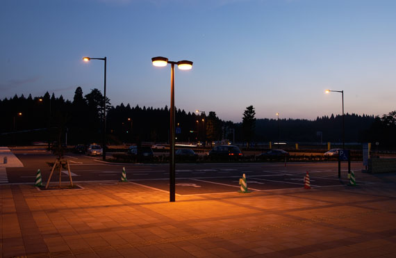 駐車場の照明には、暖かみのある光色のFECサンルクスエースを光源とするミーティスを設置、光害対策とともに省エネが図られています。