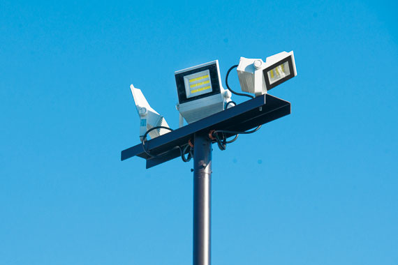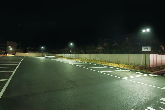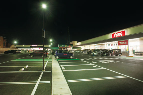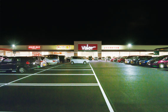 賑わいのある商業施設の看板や駐車場を省エネに貢献するLED投光器で照らし、快適な照明環境を創出