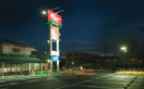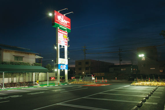 広告看板と駐車場の照明器具として、省エネに貢献するLED照明をご採用いただき、超広角タイプの配光を有するLED投光器「レディオック フラッド ネオ」が設置されました。看板面ではむらを抑え、駐車場では舗装部分だけではなく空間も明るくすることで歩行者にも快適な視環境を創出。光色は爽やかな白色系とし、店内から漏れる賑わいの光とともに近隣への漏れ光を配慮した照明設備となっています。また照明器具を小型で同一形状とすることで、昼間の景観にも配慮しています。