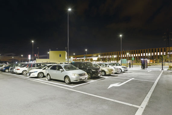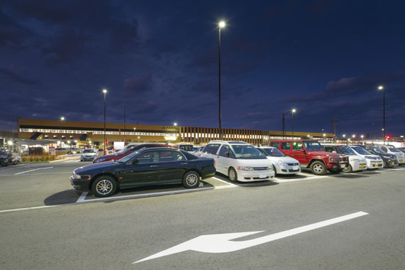 第1、第2、第3駐車場、及び駅南駐車場には、景観を考慮したダークブラウン色のLED道路灯「レディオック ロード」が設置され、省エネに貢献するLEDの光で駐車場を安全・快適に照らしています。また、駅北側には店舗や住宅が、南側には水田が広がっていることを考慮し、水田などへの漏れ光を防ぐため、必要な箇所は後方遮光ルーバ付としました。