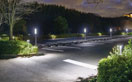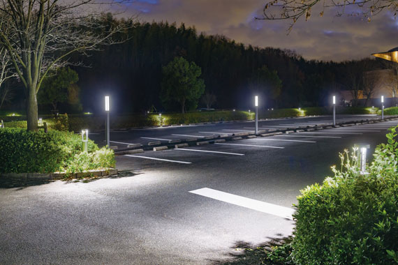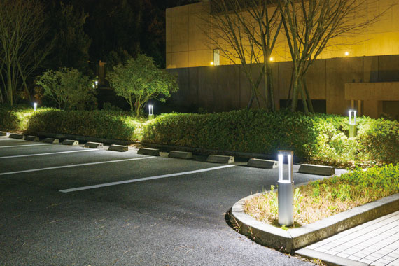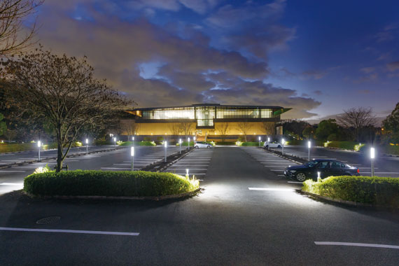 広大な敷地に広がる最先端研究所の景観にふさわしいデザインのLEDアプローチライトで駐車場を安全に照らし出す