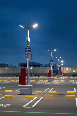 平面駐車場は色温度3000KのLED街路灯「レディオック エリア アリビオ」「レディオック エリア ミーティスB」を選択し、街並みに溶け込む暖かみのある光としました。外周道路には周辺への漏れ光も考慮のうえ、鉛直方向の角度調整も可能な色温度3000Kの「レディオック エリア アリビオ」を採用。また、商業棟屋上駐車場及び立体駐車場屋上(東棟、西棟、北棟)については、効率を重視した色温度5000Kの「レディオック エリア アリビオ」を採用。光源のまぶしさを考慮し、車路、車室、駐車場全体を安全に照らしています。1階のレストラン・カフェゾーンには緑に囲まれたテラス席があり、またイベントステージも設けられているなど、開放的な屋外空間を適切な光で照らし、魅力的な夜間景観を演出しました。