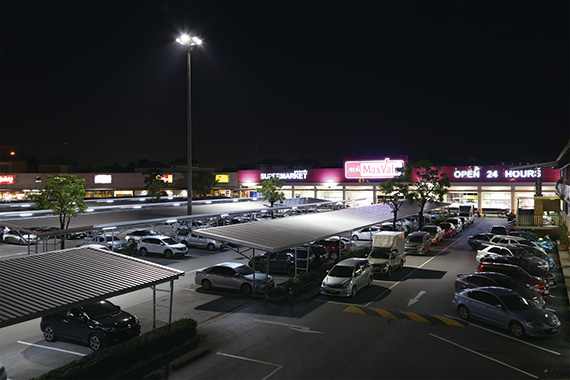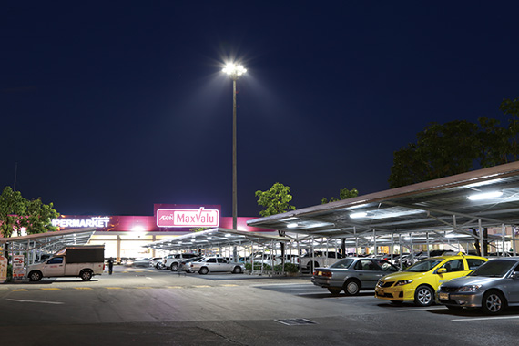 2016年12月に駐車場の照明を変更し、ハイマスト照明として「IWASAKI LEDioc FL200」(レディオック フラッド ブリッツ)を6台導入済みで、今回は、ELT〈EYE LIGHTING (THAILAND) CO., LTD.〉がタイで協業しているL&E製のLED製品を中心に計画し、ご採用いただきました。新規に取り付けた駐車場の屋根には、防水形LED照明器具を設置しました。これによりハイマスト照明とともに夜間もお客さまが安全・安心にご利用いただける照明環境を提供しています。