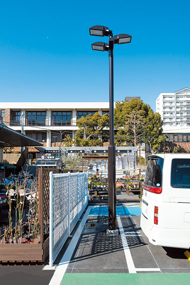 また、特注で3灯用の外灯設計を行い、ポール数量の削減を図りました。外周部には、平塚市の条例に基づき、植栽を配して自然環境にも配慮しています。