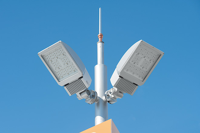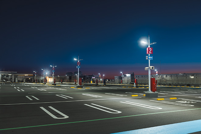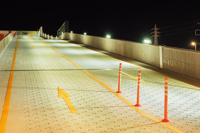 屋外照明については、外周道路、平面駐車場、商業棟・立体駐車場棟の屋上駐車場、駐輪場など主要なエリアには、同一デザインで横方向・前方向・全方向と3タイプの配光から選べるLED街路灯「レディオック エリア アリビオ」を採用いただき、施設全体に統一感を持たせました。また、人の目に触れる機会が多い商業棟屋上駐車場へつながるスロープには、低位置から路面を均一に照らすLED道路灯「レディオック ロード 低位置照明」を設置し、器具本体の前面ガラスは器具内部が見えないようフロスト仕様にするなど、器具の見え方にも十分な配慮をしています。外構及び平面駐車場を照らす光は、色温度を周囲の景観に溶け込むように暖かみのある落ち着いた雰囲気の電球色とし、一方で、商業棟・立体駐車場棟の屋上駐車場を照らす光は昼白色とするなど、用途に合わせて光の色味を使い分けています。明るさに関しても、指定の照度基準を満たしつつ、周辺の住宅への漏れ光にも配慮した器具の配置、取付角度にするなど、地域に寄り添った、快適で居心地のよい照明環境を創出しています。