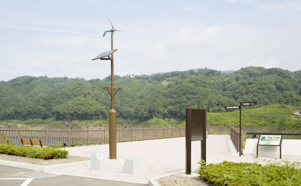Myリストに追加福島県にある木戸ダムは、2008年3月に洪水調節・河川維持用水・上水道用水・工業用水などの多目的ダムとして竣工されました。見学者のための広場にハイブリッド太陽灯のアルコタイプを設置しました。リング状のデザインが特長のアルコと光源に使用したコンパクト・長寿命の白色LEDが夜間には幻想的な空間を演出します。連結点灯可能形のハイブリッド太陽灯を採用することで1基分の太陽電池と風力発電機で2灯分の電力を発電し、効率のよい照明システムを実現しました。