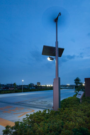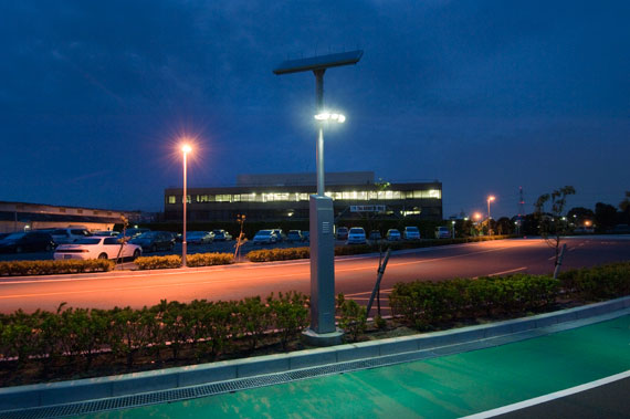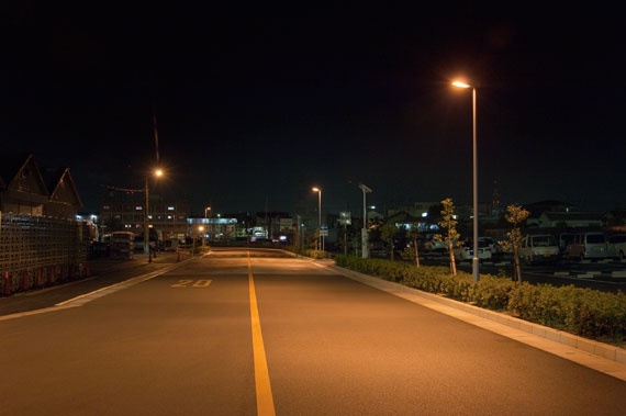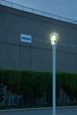 このたび、コマツ大阪工場では工場東側と国道1号線を結ぶ新たな市道が開通した背景から、その市道へ出るための新甲斐田門を新設し、道路整備を行うことにより物流の改善化を図る計画が実施されました。それに伴い来客用及び社員用駐車場の再編成も行われるようになり、工場内にて照明設備が新設されることになりました。