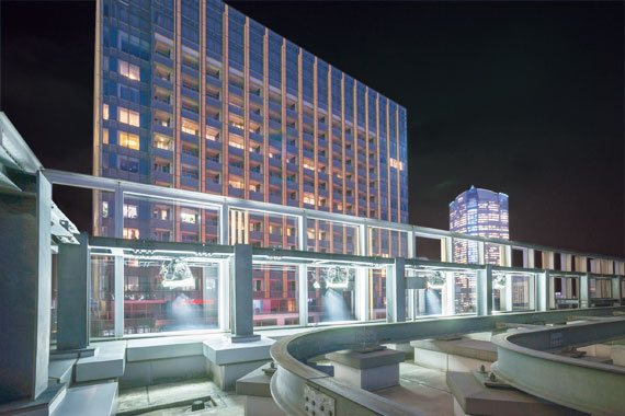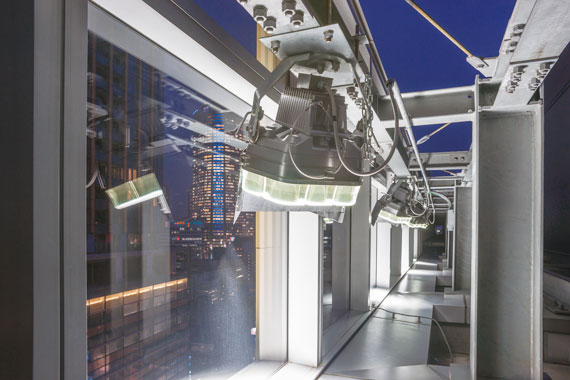 高層ビルの一つであるミッドタウンウエストの屋上階に、高出力形LED投光器「レディオック フラッド ブリッツ400W」を設置して投光照明を行うことで通路を均一に照らし、景観を損なわずに照度を上げることが出来ました。投光器は前方対角建物(オフィスビル・住居棟)へのグレア対策として特注ルーバを付け、必要箇所以外への漏れ光に配慮しています。