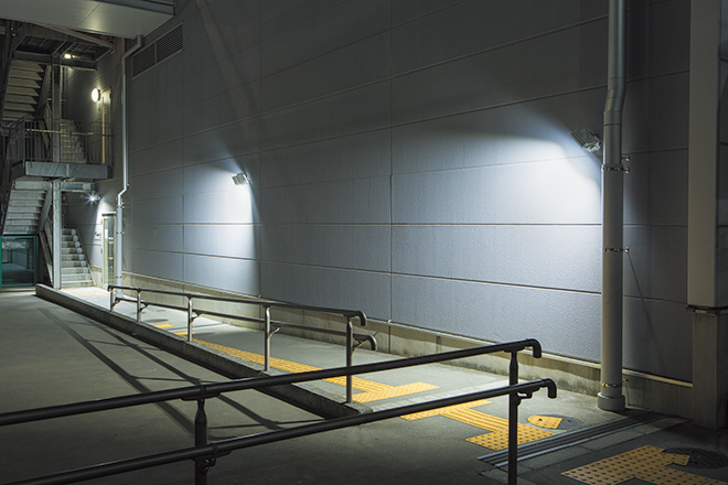 また、体育館東棟の外壁に設置されていた壁付け投光器は、コンパクトでシンプルなデザインのLED投光器「レディオック フラッド ネオ」に更新して明るさ感を向上させ、夜間の安全性を高めています。