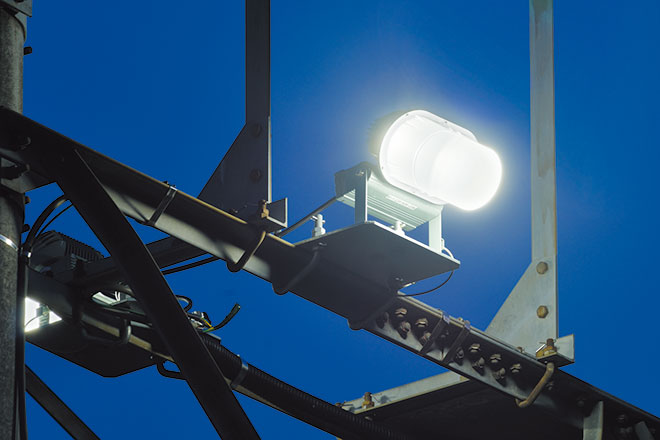 今回の照明改修については、既設照明器具更新のタイミングであったこともあり、省エネ推進を図るためLED化を実施しました。既設の電架柱に設置していた水銀ランプ双照灯に替えて、LED投光器「レディオック フラッド ブリッツ 80W」×2台を設置。また、場所に応じてエリアライトとして「レディオック フラッド ネオ 60クラス」を設置し、大幅な省エネを実現しました。