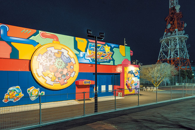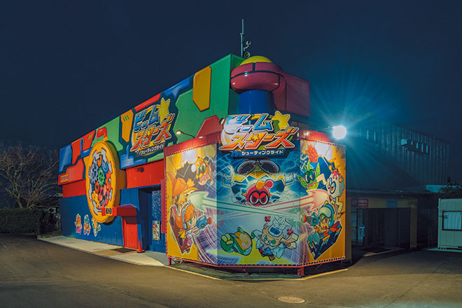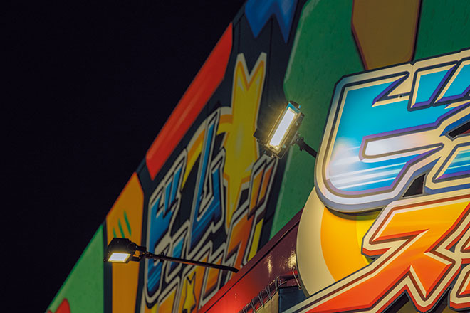 新アトラクションのライトアップについては、電球色の「レディオック フラッド スポラート」と「レディオック フラッド ネオ」でカラフルな入口付近を照らしつつ、昼白色の「レディオック フラッド ネオ」で施設全体を魅力的に照らし出すライトアップを行っています。
