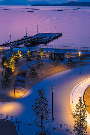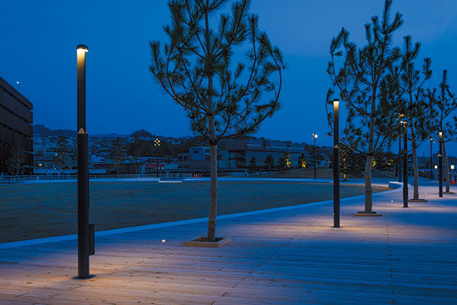 瀬戸内海の風を感じられる気持ちのよい広場を照らす照明については、景観に調和するよう十分配慮した照明器具として、LEDポールライト「ユニス スポットポールライト」、「ユニス スティック トール」、「ユニス スティック ショート」及びLEDスポットライト「レディオック ウノ」をご採用いただき、いずれも電球色の温もりのある光色で空間をやさしく照らしています。