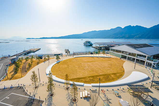 国内外から多くの観光客が訪れる世界遺産・宮島(厳島神社)の玄関口、廿日市市宮島口に、2024年4月、宮島口しゃもじ広場がオープンしました。広電宮島口駅の目の前、宮島口旅客ターミナルのすぐ横という好立地にあり、対岸の宮島や瀬戸内海をのぞみながら、思い思いの時間をゆっくりと過ごすことができる開放的な緑地空間となっています。宮島の名産品であるしゃもじを模したベンチが芝生広場を囲うように設置され、休憩場所、子どもの安全な遊び場として、またマルシェや音楽ライブなどの各種イベントが開催される新しい集いの場所として、多くの方々に親しまれています。
