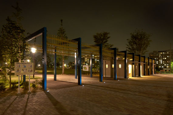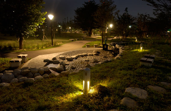 約11,000m²の面積を持つ公園内には、ルシエシリーズのステラとセラルクスを組合せたポールライトが配され、遊歩道をやさしく照らし出し、安全かつ落ち着いた雰囲気の視環境となっています。
