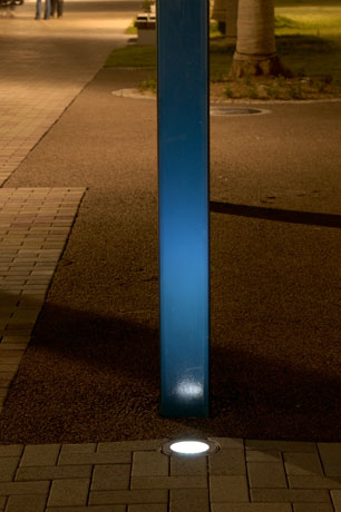 また、トイレの柱近くには白色LEDを使った床埋込が設置され、青い柱をより引き立たせる効果的な演出をしています。