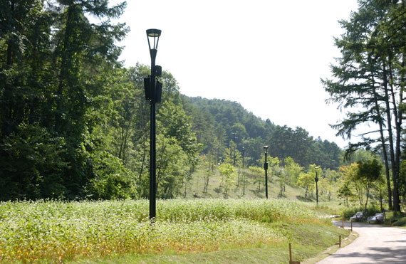 公園の駐車灯や園路灯には、パズーやミーティスなど光害を抑制し、自然環境に配慮した照明器具が採用されました。光源についてもハイラックス2500KやFECサンルクスエースといった暖かみのある光で、夜のイベント開催時などの際に来園者をやさしく迎えています。