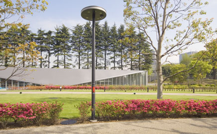 東京ミッドタウン内ミッドタウン・ガーデンにあるスーパー防犯灯は、従来の外構部分での監視通報機能に防犯などの要素をプラスしたものに加え、無線LANのアクセスポイントやユビキタス通信などの情報インフラ機能を搭載しています。光源には、白色LED(通常点灯用)と赤色LED(非常通報時点滅点灯用)、防犯カメラ用にジャンボLEDを4つ設置し、周囲の安全を守っています。